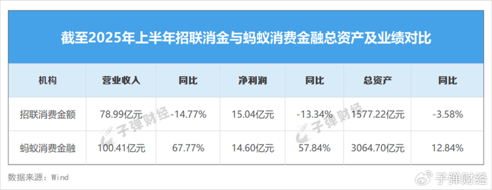 截至2025年上半年,成立于2021年的蚂蚁消费金融,以3064.70亿元的总资产遥遥领先于消金行业,几乎是第二名招联消金的两倍,营收、净利润和总资产的同比增速也远高于招联消金。