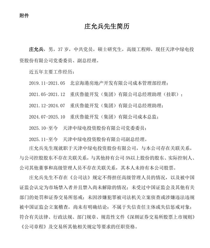 庄允兵任天津中绿电投资股份有限公司(以下简称“中绿电”)副总经理。