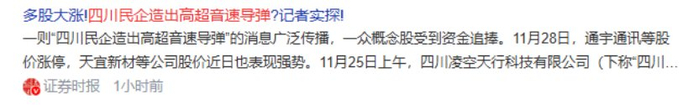 近日一则“四川民企造出高超音速导弹”登上热搜。受此影响相关有合作的公司直接涨停。