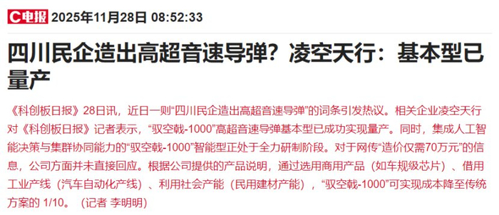 值得注意的是,早在11月25日,四川凌空天行科技有限公司微信公号就发布消息,宣布“驭空戟-1000”高超声速导弹发布。影片显示,该导弹射程为500至1300千米,速度5到7马赫,动力巡航时间360秒。该导弹还具备自动识别目标、躲避威胁等能力,可通过陆基发射车部署,专门针对海上移动平台和各类舰艇实施精准打击。