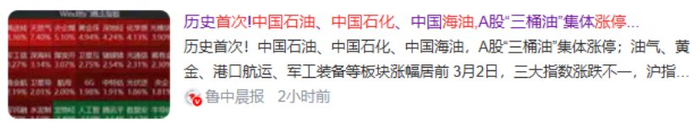 美以伊的冲突直接让A股油气股上天了,多达25股涨停,中石化、中石油、中海油更是首次同一天涨停。