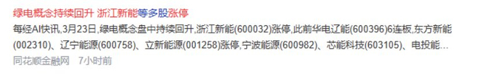 绿电概念盘中持续回升,浙江新能涨停,此前华电辽能6连板,东方新能、辽宁能源、立新能源涨停,宁波能源、芯能科技、电投能源、永泰能源跟涨。