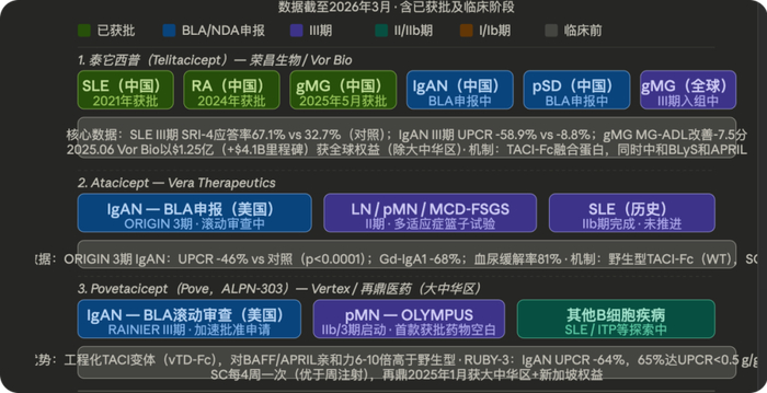 过去,贝利尤单抗(Blys单抗)在系统性红斑狼疮和其他自免疾病上的表现为Blys靶向策略打了个样,BLyS维持成熟B细胞存活,APRIL则维持浆细胞(尤其是骨髓长寿浆细胞)的存活。贝利尤单抗只堵上游,泰它西普连下游也一起封住——这意味着它对病理性抗体的清除更彻底,覆盖的患者群更宽,在以抗体介导损伤为核心病机的自免疾病上,这个机制差异意义重大。