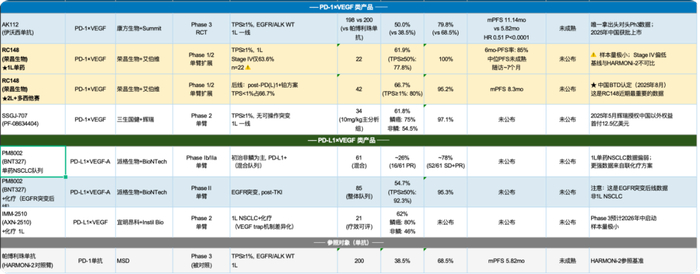 RC148的一线治疗PD-L1阳性NSCLC数据:ORR 57.1%。再看后线数据,RC148在20mg/kg剂量组做出了ORR 66.7%、PFS 8.3个月——注意这里联用了多西他赛,而AK112的单药二线数据是TPS≥1%患者ORR 42.9%、TPS患者ORR 25.0%。直接比绝对值,RC148在联用方案下的数据更好看,但我们要诚实:这不是head to head,基线不完全可比,不能刻舟求剑。