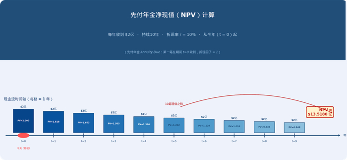 大概如此,国内市场算下来,能打入的市值294亿元。但还有VOR这边的国外收入,毕竟里程碑付款40亿美元,假设10年内拿到20亿美元,平摊到每年2亿美元,根据r=10%折现,可以得到净现值为13.52亿美元收入,约合人民币93亿元。