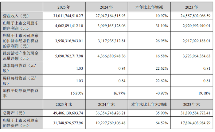 报告期内,三花智控实现营业收入310.12亿元,同比增长10.97%;归属于上市公司股东的净利润40.63亿元,同比增长31.10%;扣除非经常性损益净利润39.58亿元,同比增长26.95%。经营活动现金流净额50.91亿元,同比增长16.58%,现金流表现稳健。