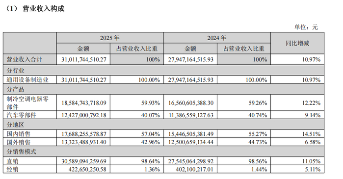 年报显示,制冷空调电器零部件业务2025年贡献营收185.85亿元,同比增长12.22%,毛利率提升至28.77%。