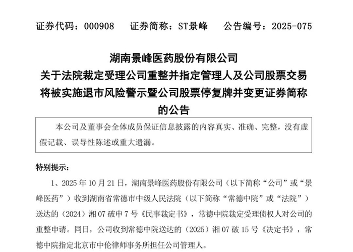 10月21日,ST景峰(000908.SZ)发布公告称,公司收到湖南省常德市中级人民法院送达的《民事裁定书》及《决定书》,法院裁定受理债权人对公司的重整申请,并指定北京市中伦律师事务所担任公司管理人。