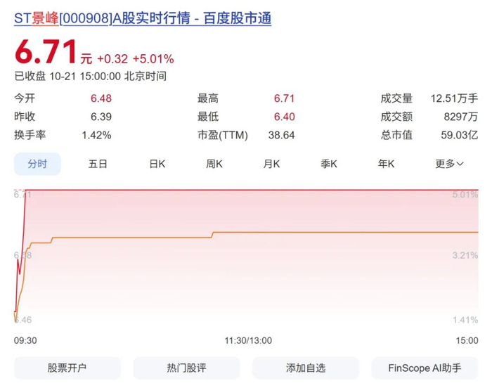 10月21日,ST景峰涨停,报收于6.71元/股,总市值59.03亿元。