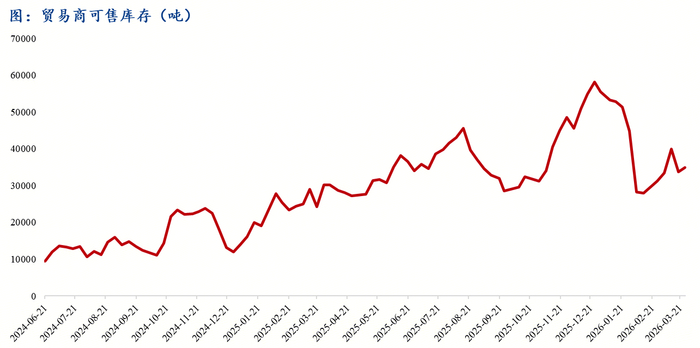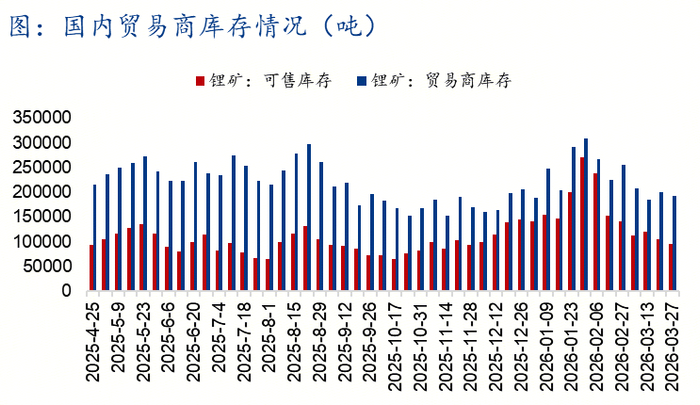 成交与库存:上周碳酸锂成交量缩至8394吨(较前一周下滑6616吨),下游高价承接力弱。从贸易商可售库存来看,上周随着碳酸锂盘面价格上涨,锂盐厂出货意愿增加,截至3月26日,碳酸锂贸易商可售库存为34980吨,较前一周增加1220吨。
