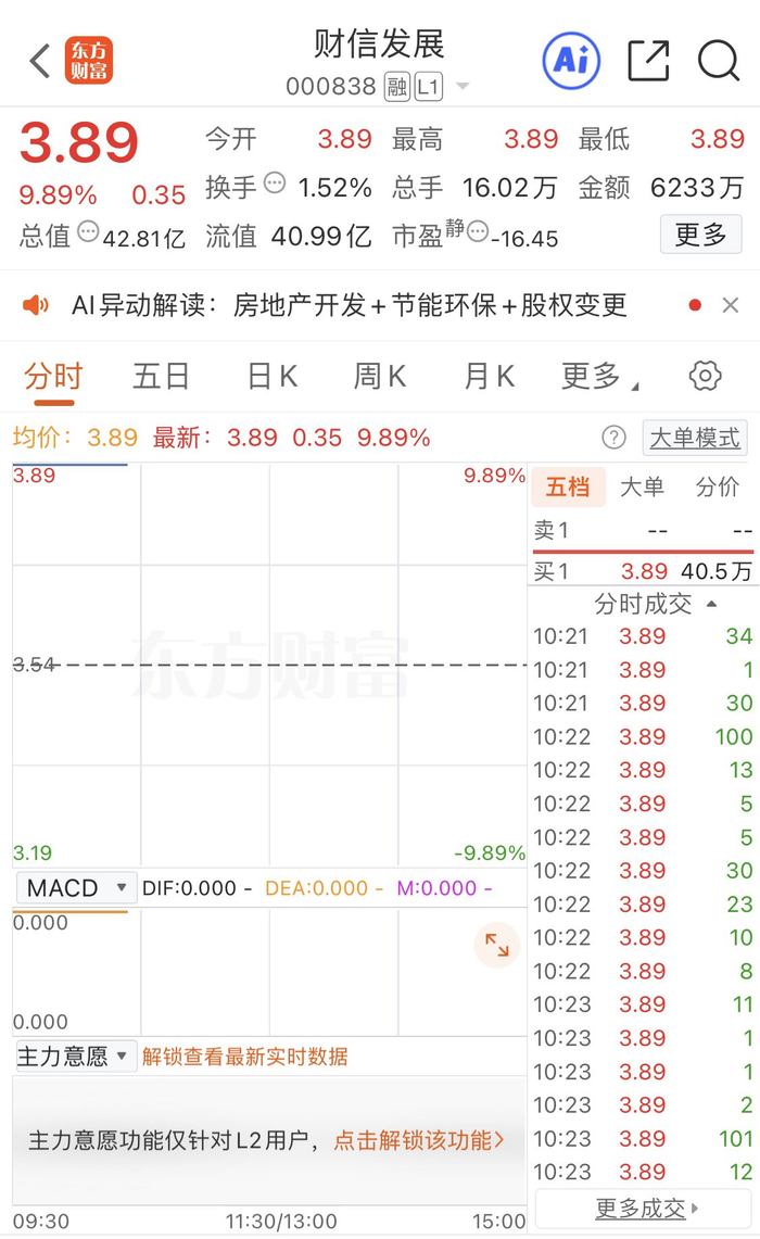 12月3日,财信发展开盘即涨停,最新股价3.89元/股,最新市值42.81亿元。