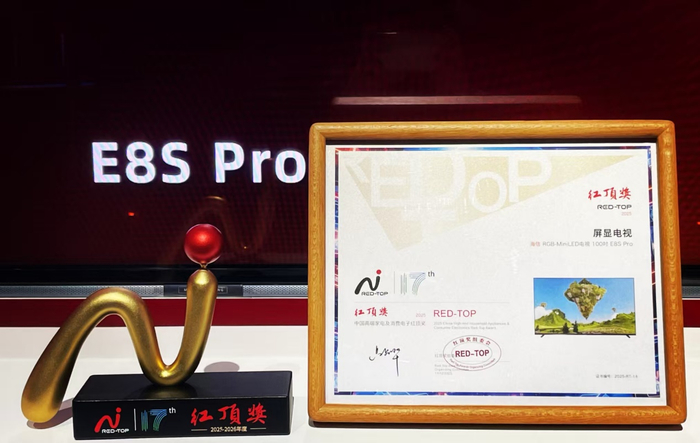 12月17日,第17届中国高端家电趋势发布暨红顶奖颁奖盛典在北京首钢园・SoReal科幻乐园举行,本届红顶奖的主题为“耀·不凡”,聚焦高端家电的价值彰显与行业升级。海信RGB-MiniLED电视E8SPro凭借“光色同控”的关键技术突破,打造极致画质体验,一举斩获电视行业唯一的红顶奖大奖,海信激光电视探索X1Ultra荣获提名奖。海信电视已经连续7年闪耀红顶奖舞台,彰显了在高端显示领域的引领地位。