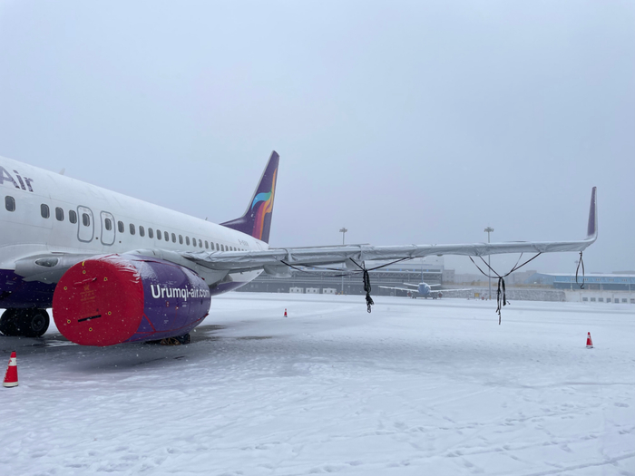 在乌鲁木齐,一场大雪过后,机务人员为飞机穿上特制的“翼衣”保温,就这样一个小动作,每年可节省2.5万升除冰液,直接节约成本70万元以上。