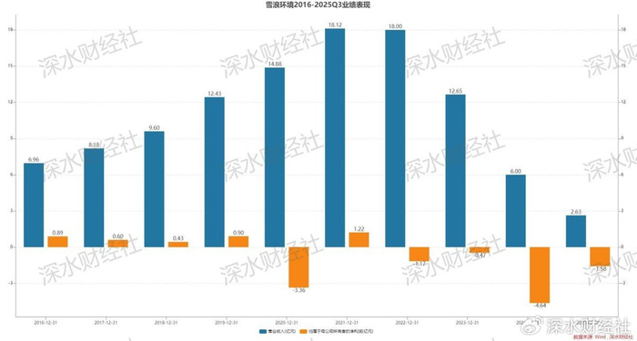 数据显示,雪浪环境2021年到2024年的营收从18.13亿滑到了6亿元,净利润从1.22亿直接滑到了亏损4.64亿。2025年前三季度营收分别为2.63亿和亏损1.58亿,经营情况继续恶化。