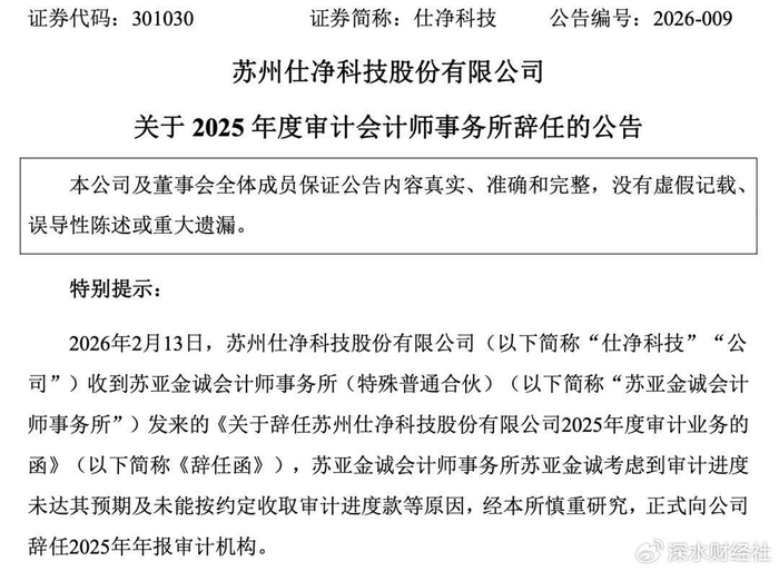 2月25日晚间,仕净科技发布公告,2月13日,公司收到苏亚金诚所发来的《关于辞任苏州仕净科技股份有限公司2025年度审计业务的函》。