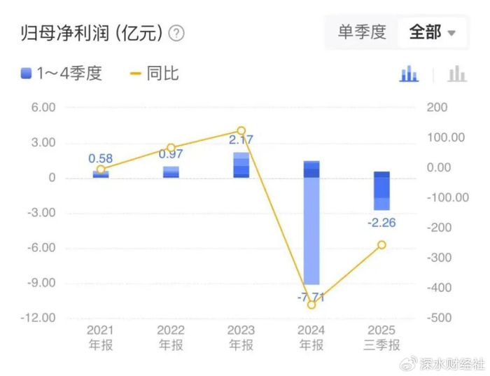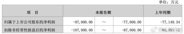 公司发布的2025年业绩预告显示,预计全年归母净利润亏损7.70亿元至9.70亿元,连续第二年巨额亏损;扣非净利润亏损8.70亿元至10.70亿元,亏损幅度进一步扩大。