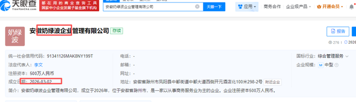 值得一提的是,面对这场突如其来的“全网误读”,酒企没有一板正经的声明,3月1日,明光酒业抖音官方反而大方地发视频接住这一波泼天的流量,说“感谢网友赐名‘奶绿波’!”3月2日迅速注册相关商标。