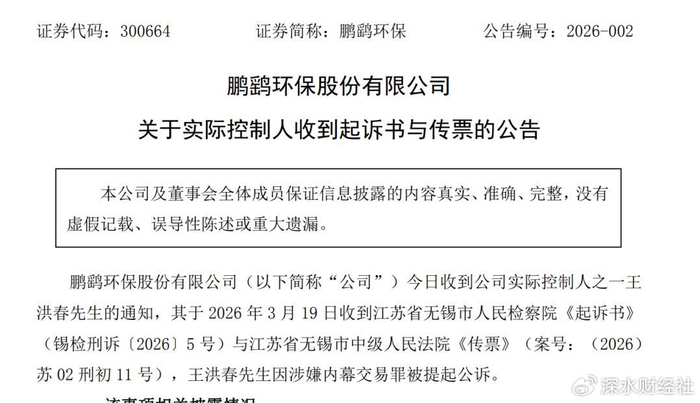 3月20日晚间,创业板上市公司鹏鹞环保发布公告,披露公司实际控制人之一王洪春于3月19日收到江苏省无锡市人民检察院《起诉书》与无锡市中级人民法院《传票》,其因涉嫌内幕交易罪被正式提起公诉。