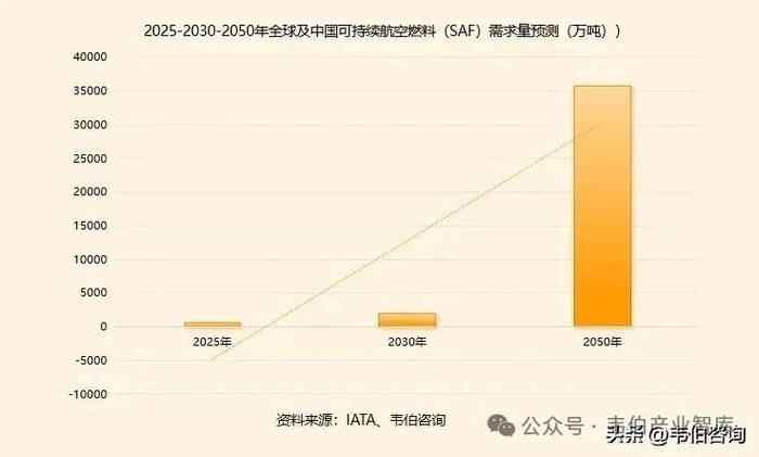 国际航空运输协会预测:2025年和2030年全球可持续航空燃料(SAF)需求量将分别达到600万吨和2000万吨;到2050年,SAF将承担航空业65%以上的减排贡献,需求量高达35,800万吨。