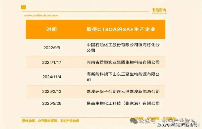 2025年3月13日,嘉澳环保子公司连云港嘉澳新能源公司获颁《技术标准规定项目批准书》(编号:CTSOA0310)证书,其“HEFA-SPK合成烃组分”成为第四款通过适航审定的国产SAF产品。