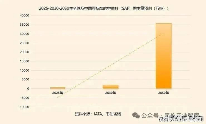 国际航空运输协会预测:2025年和2030年全球可持续航空燃料(SAF)需求量将分别达到600万吨和2000万吨;到2050年,SAF将承担航空业65%以上的减排贡献,需求量高达35,800万吨。