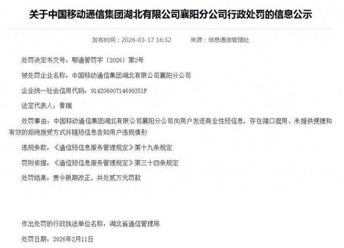 近日,中国移动通信集团湖北有限公司襄阳分公司因向用户发送商业性短信息存在端口混用、未提供便捷拒绝方式并告知违规情形,被责令限期改正并处以2万元罚款。