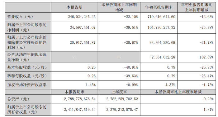 报告显示,北路智控公司前三季度营业收入为7.11亿元,同比下降12.63%;归母净利润为1.05亿元,同比下降25.38%;扣非归母净利润为9336.42万元,同比下降21.78%;基本每股收益0.79元。