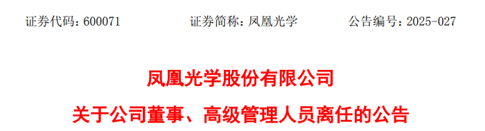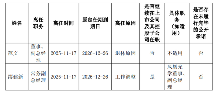 公告显示,凤凰光学董事会于11月17日收到范文、缪建新递交的书面辞职报告。范文因退休原因,申请辞去公司董事、副总经理职务;缪建新因工作原因,申请辞去公司常务副总经理(代行总经理职责)。范文原定任期到2026年12月26日,退休后将不再在上市公司及其控股子公司任职;缪建新原定任期同样到2026年12月26日,工作调整后仍将担任凤凰光学董事、副总经理。