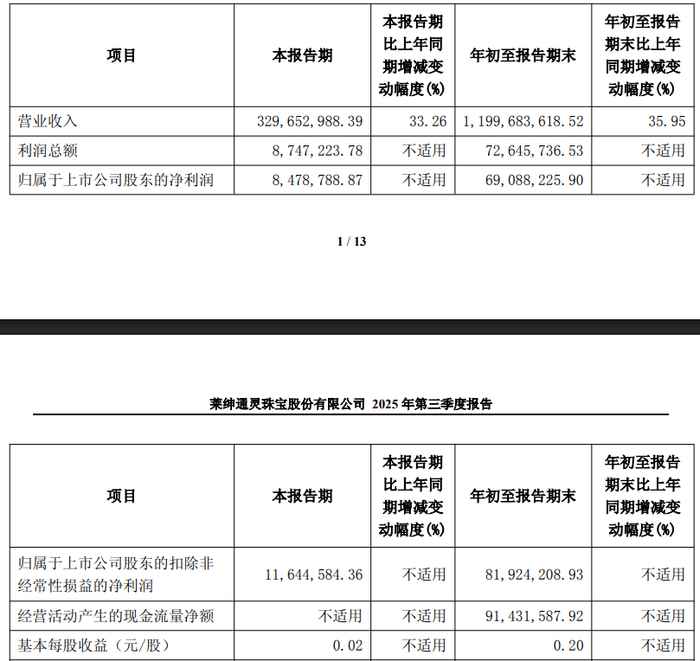瑞财经 钟鸣辰 莱绅通灵(SH603900)近日发布2025年三季报,前三季同比大幅扭亏为盈。