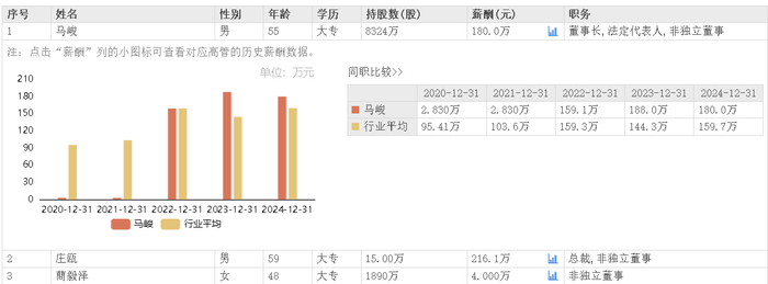 据东方财富网数据,莱绅通灵董事长马峻2024年所获薪酬为180万元,相较上年薪酬188万元微降。
