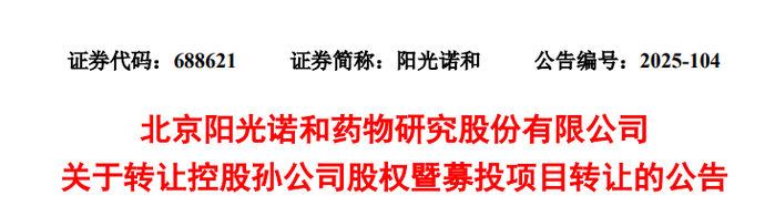 公告显示,阳光诺和公司全资子公司北京诺和德美医药技术有限公司(“诺和德美”)与北京中健培联医学研究院(普通合伙)(“中健培联”)签署《上海美速科用数据有限公司股权转让协议》,诺和德美以 200 万元现金对价将其持有的上海美速科用数据有限公司(“美速科用”)70%的股权转让给中健培联,上海诺和美创医药研究合伙企业(有限合伙)以 0 万元现金对价将其持有的美速科用 30%的股权转让给中健培联。交易完成后,诺和德美不再持有美速科用股权,美速科用不再纳入公司合并报表范围。鉴于美速科用为已结项募投项目“临床试验服务平台建设项目”的实施主体之一,故本次交易同时涉及部分募投项目转让。