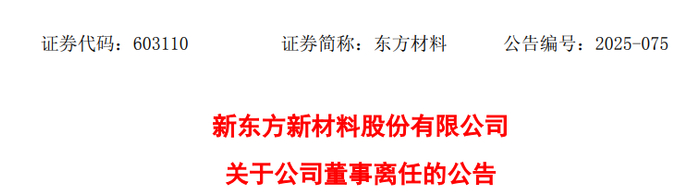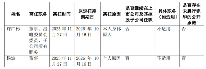 公告显示,东方材料董事会于11月27日收到董事许广彬、杨波提交的书面辞职报告。许广彬因本人身体原因,申请辞去公司第六届董事会董事、战略委员会委员职务,同时一并辞去在子公司担任的所有职务;杨波因个人原因,申请辞去公司第六届董事会董事职务。二人辞职后将不再担任公司任何职务,原定任期到期日为2026年10月16日。