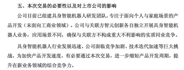 上纬新材表示,公司目前已组建具身智能机器人研发团队,专注于面向个人与家庭场景的产品开发(未面向工商业领域)。公司与关联方智元创新各自独立开展具身智能机器人业务,应用场景不同,确保与关联方不构成重大不利影响的实质同业竞争。