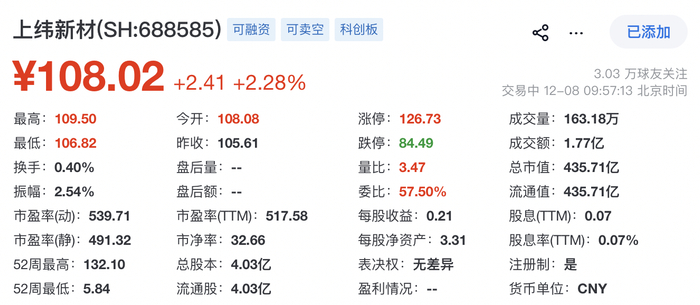 截至发稿时,上纬新材报108.02元,涨2.28%,总市值约435.71亿元。自年初至今,其股价累计上涨1528.64%。