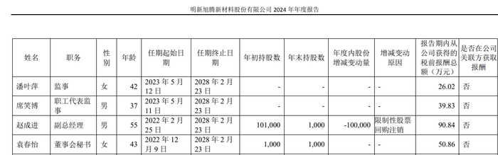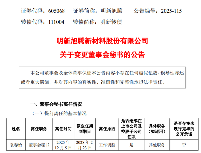 公告显示,明新旭腾新材料股份有限公司董事会近日收到董事会秘书袁春怡的书面辞职报告,其因工作调整,于2025年12月5日提前离任,原定任期到2028年2月23日。离任后,袁春怡将继续在公司及控股子公司担任其他职务,且不存在未履行完毕的公开承诺。截至公告披露日,袁春怡直接或间接持有公司股份51,000股。