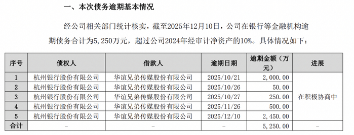 另外,12月10日,华谊兄弟公告称,公司受经济形势影响,因部分回款资金未能如约到位,造成暂时性流动资金紧张,使得公司阶段性出现个别债务未能如期偿还的情形。截至2025年12月10日,公司在银行等金融机构逾期债务合计为5250万元,超过公司2024年经审计净资产的10%。