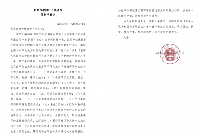 瑞财经 刘治颖 近日,华谊兄弟传媒股份有限公司(以下简称:华谊兄弟)及其法定代表人王忠军新增一则限制消费令,涉及广告合同纠纷案件,申请人为北京泰睿飞克科技有限公司,执行法院为北京市朝阳区人民法院。