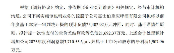 据《调解协议》约定,重庆啤酒下属实施该包销业务的控股子公司嘉士伯重庆啤酒有限公司拟将以前年度基于本案一审判决计提的预计负债2.54亿元冲回,同时,基于谨慎性原则,拟计提一次性支付的量价差结算款等负债2.17亿元。上述会计处理预计增加公司2025年度利润总额0.37亿元、归属于上市公司股东的净利润0.19亿元。