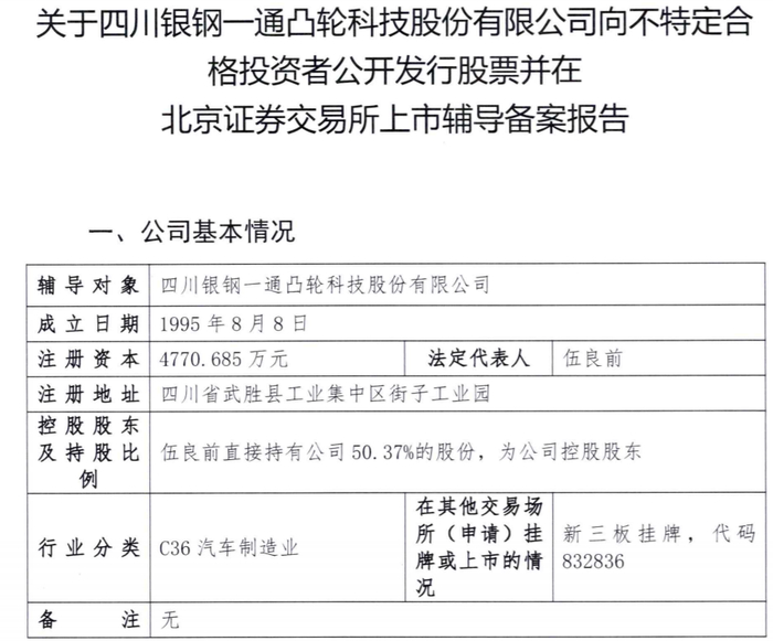 瑞财经 王敏 12月17日,四川银钢一通凸轮科技股份有限公司(以下简称“银钢一通”)在四川证监局启动IPO辅导备案,拟北交所上市,辅导机构为东方证券。
