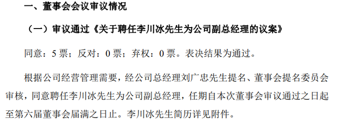 同日,中超控股召开第六届董事会第三十次会议,经公司总经理刘广忠提名、董事会提名委员会审核,同意聘任李川冰为公司副总经理,任期自本次董事会审议通过之日起至第六届董事会届满之日止。