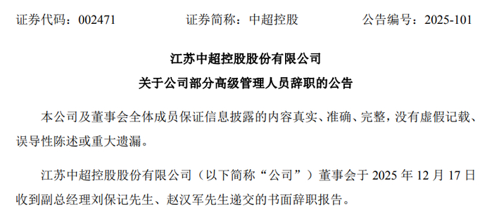 公告显示,江苏中超控股股份有限公司董事会当日收到副总经理刘保记、赵汉军递交的书面辞职报告。刘保记因工作变动申请辞去副总经理职务,辞职后仍担任公司全资子公司无锡市明珠电缆有限公司执行总经理职务,下一步,公司拟委派其担任全资子公司江苏长峰电缆有限公司董事长职务。赵汉军同样因工作变动申请辞去副总经理职务,辞职后仍担任江苏远方电缆厂有限公司董事长、总经理职务。