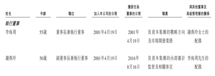 李海周担任公司董事长兼执行董事,谢燕玲担任副董事长兼执行董事。