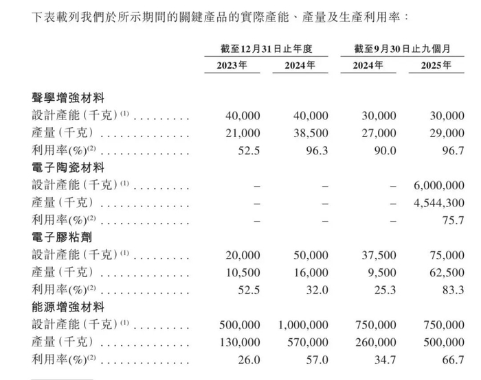核心收入来源声学增强材料各期产量分别为21吨、38.5吨及29吨,产能利用率分别为52.5%、96.3%、96.7%。