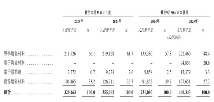 分产品看,声学增强材料是贝斯特新材料的核心收入来源,产品各期收入分别为2.12亿元、2.19亿元及2.22亿元,2025年前9个月,该产品收入已经超过2022年及2023年全年。