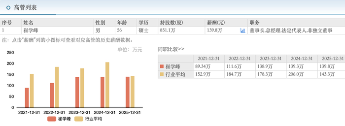 业绩大增的同时,瑞财经留意到,金海通董事长兼总经理崔学峰,2025年的薪酬由139.3万微增至139.8万元,涨薪5千元。