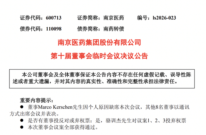 瑞财经 刘治颖3月17日,南京医药(SH600713)发布第十届董事会临时会议决议公告,会议于3月16日-17日以通讯方式召开,8名董事出席表决(Marco Kerschen因个人原因缺席)。全部6项议案均获通过,但董事骆训杰对其中3项人事相关议案投出弃权票。