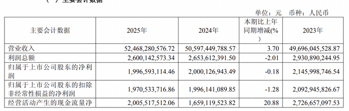 2025年,国药股份实现营业收入524.68亿元,同比上升3.70%;归属于母公司净利润19.97亿元,同比下降0.18%;归属于母公司扣非净利润19.71亿元,同比下降1.28%。