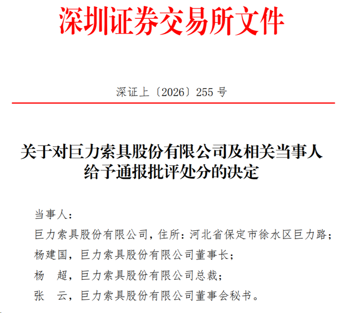 鉴于上述违规事实及情节,依据深交所《股票上市规则(2025年修订)》第13.2.1条、第13.2.3条的规定,经深交所自律监管纪律处分委员会审议通过,深交所作出如下处分决定:对巨力索具给予通报批评的处分;对巨力索具董事长杨建国、总裁杨超、董事会秘书张云给予通报批评的处分。
