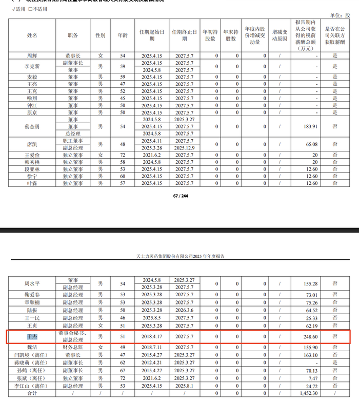 瑞财社注意到,2025年,天士力副总经理、董事会秘书于杰薪酬为248.6万元,位居董高首位。