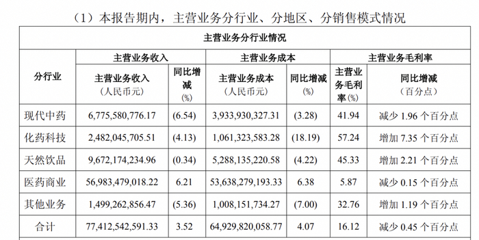 分业务来看,2025年,白云山医药商业板块撑起公司七成以上营收,实现收入569.83亿元,同比增长6.21%。现代中药、化药科技、天然饮品、其他业务这四大业务板块分别实现收入67.76亿元、24.82亿元、96.72亿元、14.99亿元,分别同比下降6.54%、4.13%、0.34%、5.36%。